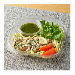 「冷たいパスタ バジルソース」価格は554円。チーズ、松の実、にんにくを効かせた、香り高いバジルソースの冷たいパスタ。蒸し鶏、トマト、リーフレタス、パルメザンチーズ、パセリ、レモン等をトッピングしている。発売地域は関東地方。