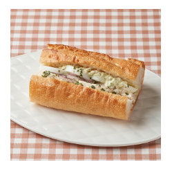 「石窯パリジャンサンド チキン&ゆでたまご~バジルソース仕立て~」価格は369円。チキン、ゆでたまご、バジルソース、 紫玉ねぎを合わせた石窯パリジャンサンド。バジルペーストに、卵黄を使用したマヨソースで仕立てたバジルソースと、隠し味にマスタードを少量加えている。発売地域は関東地方。