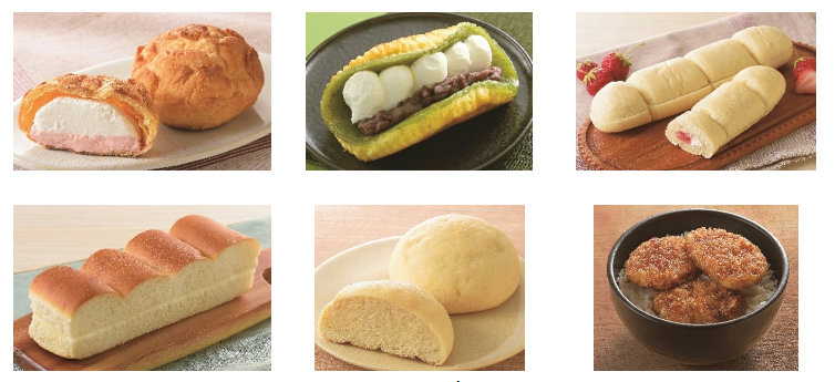 上段左から「パイシュー(越後姫いちごクリーム&ホイップ)」税込価格192円(以下同)、「もちおむれっと(新潟県産米粉)」279円、「ちぎりぱん(越後姫いちごのジャム&ホイップ)」171円。下段左から「牛乳パン(ヤスダヨーグルト)」149円、「米粉入りメロンパン(新潟県産米 新之助の米粉)」140円(新潟県・長野県・山梨県・群馬県・栃木県・茨城県のみで販売)、「新潟タレカツ丼」549円(新潟県・長野県・山梨県・群馬県・栃木県・茨城県の「まちかど厨房」導入の約800店舗で販売)。