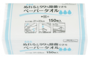 「ぬれると99%除菌できるペーパータオル」は、サトウキビの搾汁後に残る繊維部分「バガス」を50%使用している。バガスは、世界各国で12億トン以上生産されるサトウキビから1億トンも発生していると言われている。このバガスを再利用することで、紙の原料である木材の消費を抑制し、CO2削減にもつなげる。使い切りタイプだが、資源を有効活用した環境にやさしい商品となっている。サイズは約21×23cm(1枚当たり)、150枚入りで 198円(税込み、以下同じ)。