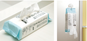 また、ふんわりした触り心地の「フレッシュタオル」も同時発売する。毎日の洗顔やクレンジング後のふき取りに便利で、衛生的な使い切りタオル。レーヨン100%でふんわりした触り心地なのに簡単には破れない。普段使いはもちろん、災害時などにも活躍する。この製品は、2通りの取り出し方ができる。ティッシュのように置いて取り出す方法と、フックやSカンで吊るして、下から引き出して取り出す方法がある。サイズは(約)20×20cm(1枚当たり)、50枚入りで298円。