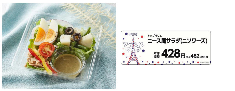 南仏のプロヴァンス地方ニースの名物料理。トマト、いんげん、じゃがいも、ゆで卵、ツナ、黒オリーブなどのサラダに、アンチョビソースベースのドレッシング付き。価格は428円。