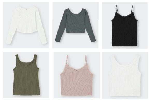 「コットンブレンドリブクロップドヘンリーネック T(長袖)」、「コットンブレンドリブクロップドワイド T(長袖)」、「コットンブレンドリブレースキャミソール」、「コットンブレンドリブレースタンクトップ」、「コットンブレンドリブクロップドキャミソール」、「コットンブレンドリブクロップドタンクトップ」。価格はすべて990円(税込)となっている。