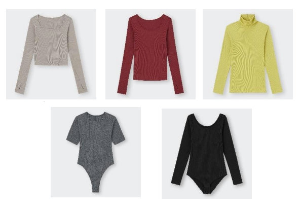 ラインアップは、「ストレッチリブクロップド T[12分丈]」、「ストレッチリブ U ネック T[12分丈] 」、「ストレッチリブタートルネック T[長袖]」は各990円。「ストレッチリブボディスーツ[半袖]」、「ストレッチリブボディスーツ[長袖]」は各1290円。