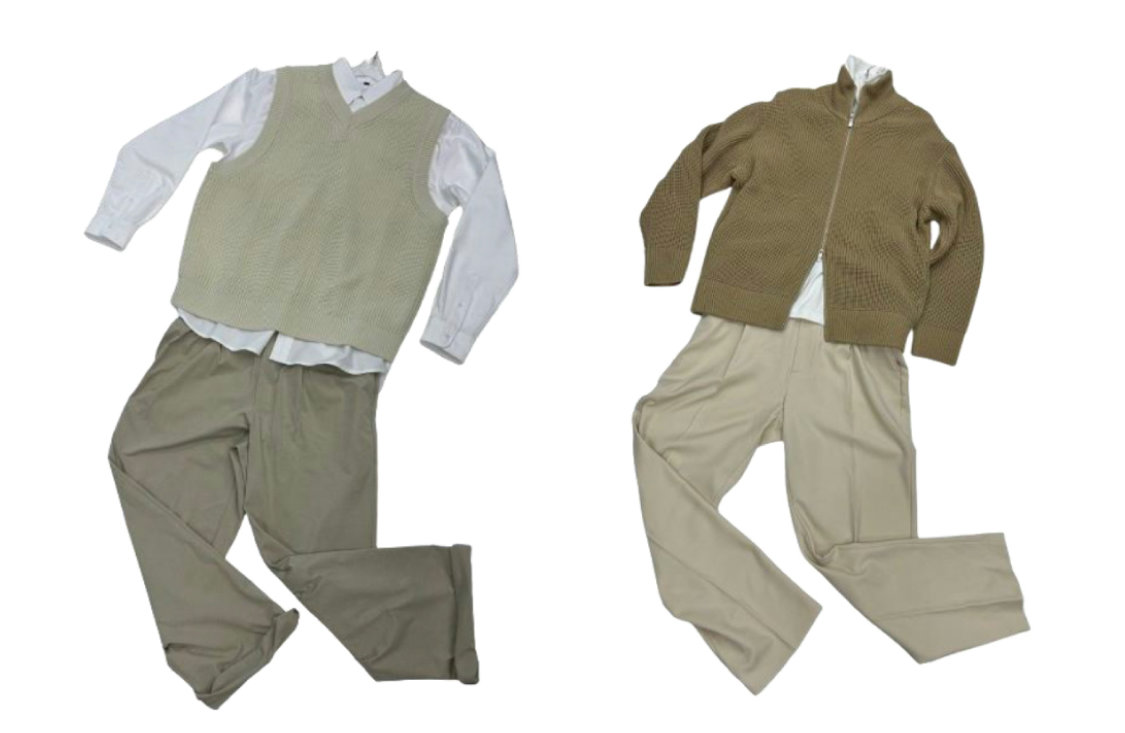 左:オーバーサイズニットベスト、汚れが落ちやすいオックスシャツ、スムースジャージーリラックスパンツの3点とも1500円。右:ドライバーズニットは2500円、タックワイドパンツは1900円。