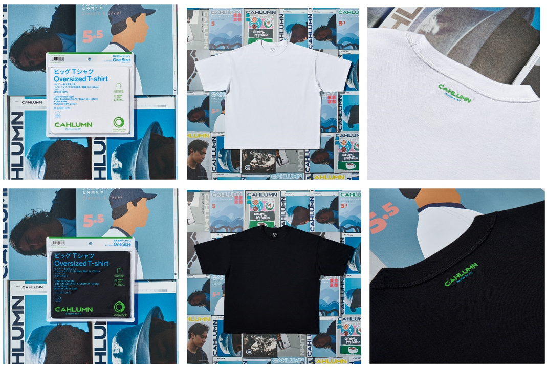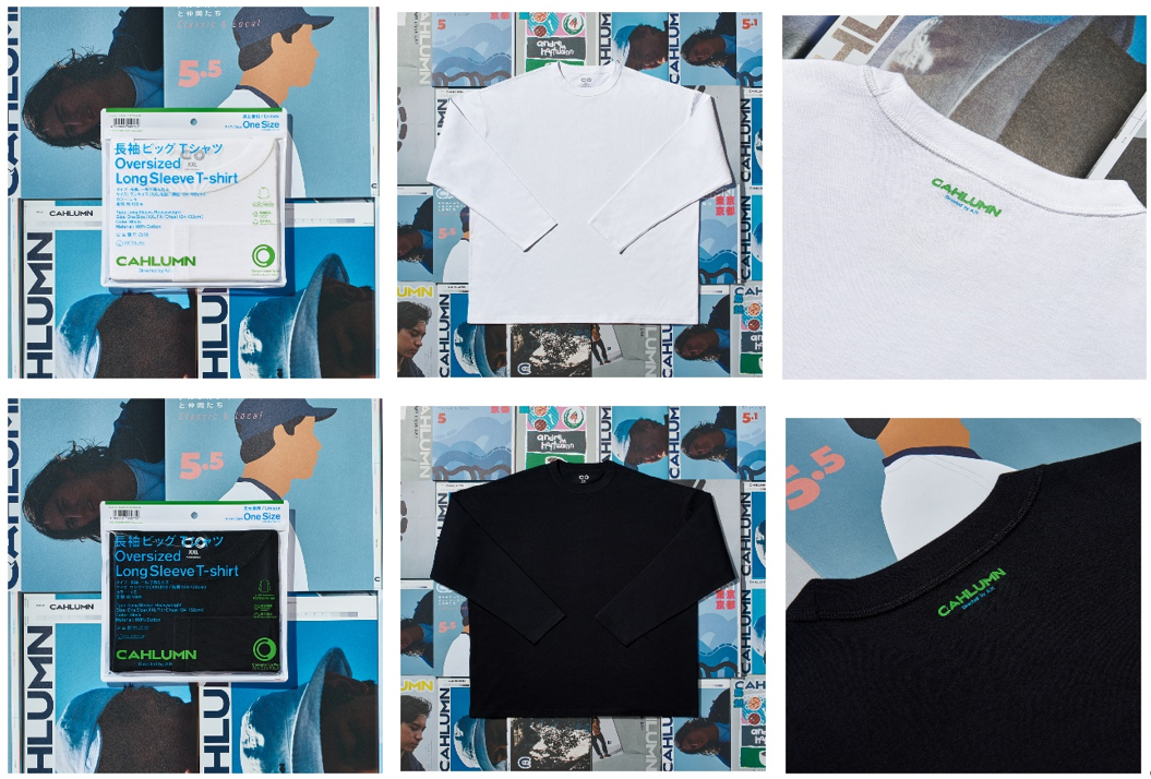 「CAHLUMN」はスタイリスト長谷川昭雄氏ディレクションのもとアパレルとファッションマガジンを制作している。コンビニエンスウェアの中でも代表的なアイテムである無地のアウターTシャツを「CAHLUMN」らしいデザインで、夏のコーディネートの主役となるビッグシルエットで表現している。背面のネック部分にはファミリーマートカラーで「CAHLUMN」のロゴを小さくあしらった。