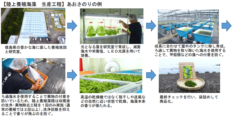 元となる藻や培養胞子を研究室で育成し、滅菌海水や栄養塩、LED光源を用いて施設内で培養した後、成長に合わせて屋外タンクに移してさらに育成する。ろ過して異物を取り除いた海水を使用して育成することで甲殻類などが藻に付着することを防ぐため、通常の養殖では2回以上行う収穫後の洗浄・異物除去工程が1回で済む。高温の乾燥機ではなく陰干しや送風などの自然に近い状態で実施することで香りが飛ぶことを極力抑えられるため、海藻本来の香り高い風味がそのまま活かされる。