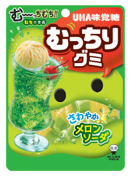 「UHA味覚糖 むっちりグミメロンソーダ」は、一度食べるとやめられない絶妙なむっちり食感を追求したさわやかなメロンソーダ味のグミ。噛み心地が良く、グミの美味しさを最大限に楽しむことができる食感を実現した。本体価格は198円(以下同)。