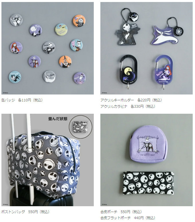 「ティム・バートン ナイトメア―・ビフォア・クリスマス」の「ジャック・スケリントン」を中心に「サリー」「ゼロ」など、様々なキャラクターデザインがハロウィンを盛り上げてくれる商品として登場する。缶バッチ、アクリルキーホルダーやカラビナ、キャリーケースにセット出来るキャリーバッグなど、全23品番をラインアップする。