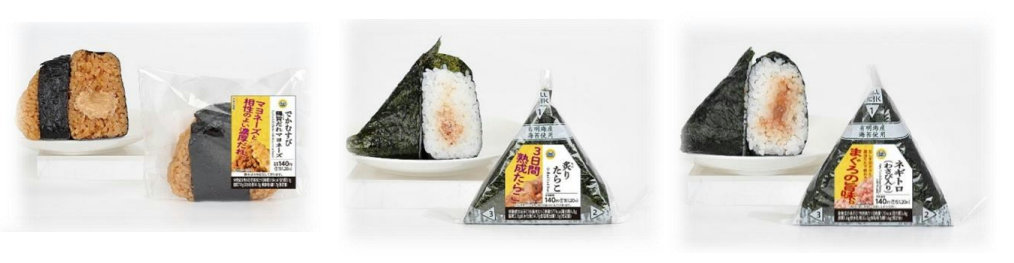 左「でかむすび 鶏旨だれマヨネーズ」は、炭火風味が香るテリヤキソースを使用。濃口醤油とたまり醤油を併用した焼肉だれを使用し、唐辛子でアクセントを付け、鶏そぼろに玉ねぎを加て食感を出したおにぎりとなっている。中央「手巻炙りたらこ」では、3日間熟成したたらこを使用し、たらこの粒は手切り・バラコ部分を粗目に刻んで混合することで、具材の食感をより感じられるようにした商品とした。右「手巻ネギトロ(わさび入り)」は、キハダマグロを使用し、丸大豆醤油をベースに、昆布・イリコ・鰹節・椎茸などのだしを効かせ、青さ入りの醤油たれを使用。甘口醤油たれを加えマイルドな味わいの商品となっている。3品とも本体価格は140円(以下同)。