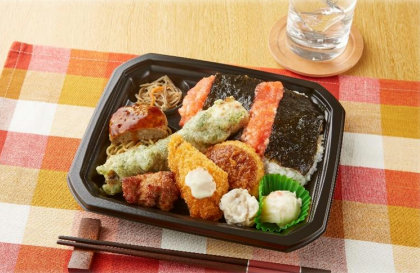 「ワイルドのり弁デラックス」は、白身フライ、コロッケ、ハンバーグ、焼売、からあげ、ちくわ天、ポテトサラダ、きんぴらごぼうの8種類のおかずを盛り付けたデラックスなのり弁当だ。価格は460円。