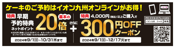 予約特典として、9月1日(日)~10月31日(火)までの予約で、イオン九州オンラインで利用できるネットポイントが20倍となるキャンペーンを実施。そのほか、9月1日(日)~12月17日(火)までの期間に、税込4000円以上の購入で300円OFFになるクーポンを配布する。