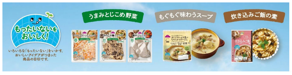 「うまみとじこめ野菜」シリーズに、商品製造の過程で出た端材を活用した「たけのこ・ごぼう・にんじんミックス」「きのこ4種ミックス」、調理に不向きな固い親芋を加工し、さといものねっとり感とジャガイモのような歯ごたえをあわせもつ親芋の特長を生かし、おいしい商品に仕上げた「親芋(さといも)」の3品目と、スープの具材に規格外のエリンギをカットして使用した「カリフラワー&豆乳のなめらかポタージュ」、カット野菜などで使用されるキャベツの芯から抽出して加工したエキスなどを原料として使用した「炊き込みごはんの素」の計5品目が新たに加わる。