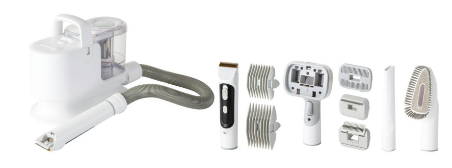 美容院に気軽に連れていけないけれど、⾃宅でもペットをキレイにケアしてあげたいという声に応えて開発。グルーミングヘッド、うぶ⽑コーム、トリムコーム、ピンコーム、服⽤ブラシ、床⽤ノズル、ホースなど豊富なアタッチメントでブラッシング・トリミング・抜け⽑の除去・⽑の掃除がこれ1台で解決。⽑を吸い込みながら、刈ったりブラッシングをしたりするので掃除の⼿間が省ける。税込価格で1万4990円(以下同)。