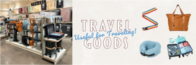 ポケッタブルバッグ・移動便利グッズ・収納グッズの3テーマで「コンパクトに収納できるトート」やサイズ調整がしやすい「スーツケースベルト」、衣類収納に便利な「コンパクト収納ケース」など、18アイテム64種類を品揃えする。
