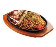 静岡県富士宮市のご当地グルメ「富士宮やきそば」の味わいを再現した焼そばと、豚肉・キャベツ・白生姜などをあわせて鉄板で1枚ずつ丁寧に焼き上げたお好み焼をセットにした商品。やきそばには、歯切れがよく、コシのある食感が特長の蒸し麺を使用し、肉かす、キャベツ、富士宮やきそばソースをあわせ、紅生姜、削り節粉をトッピングした。価格は599円。