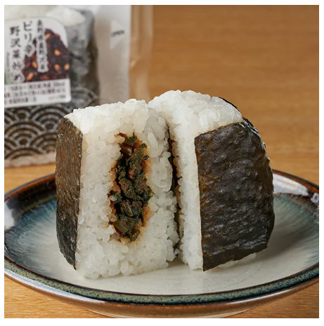 「直巻 長野県産野沢菜 ピリ辛野沢菜炒め」は、ごま油とだしつゆで炒めた長野県産野沢菜を使用したおむすび。アクセントに一味唐辛子を配合して、ピリ辛に仕立てた。本体価格は135円(以下同)。発売地域は長野県・山梨県。