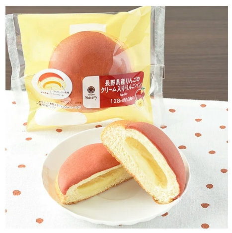 「長野県産りんごのクリーム入り りんごパン」は、長野県産りんごのピューレ入りクリームを包んだブリオッシュ生地のパンに、りんごをイメージして赤いビスケット生地をのせて焼き上げたパン。価格は128円。発売地域は長野県・富山県・石川県・福井県・岐阜県、愛知県・三重県・静岡県(一部地域除く)。