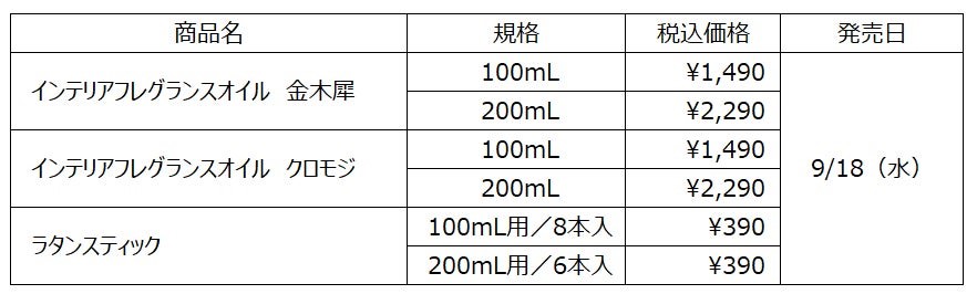 秋限定の香りは、「金木犀」と「クロモジ」の2種類。「金木犀」は、ナチュラルなキンモクセイの香りに、爽やかなオレンジや落ち着いたシダーウッドを加えたフローラルの香り。「クロモジ」は、クロモジの上品なウッディの香りに、ユーカリやアルモアズで爽やかさを加えたウッディグリーンの香り。