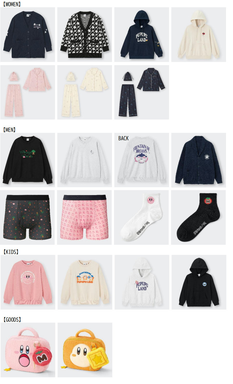 ゲームに登場する「夢の泉」を観光名所に見立ててデザインしたものや、ワドルディが観光客に扮しているキッズのスウェット、ウィメンズとキッズでリンクコーデを楽しめる地名入りのフーディなどが登場する。このほか、カービィをプリントしたサテンパジャマは同素材の巾着付き、カービィとワドルディの顔をデザインしたもこもこ素材のポーチはマキシムトマトや星ブロックのミニポーチ付きなど、自宅でも旅行先でもカービィの世界を楽しめるコレクションとなっている。商品数は全10型で、価格帯は390円~3990円。