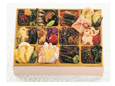 彩り豊かなファミリー向けの三段重おせち。具材は一の重に鰆西京焼、赤魚南蛮漬、白花豆、田作り、ロブスター、数の子鼈甲漬など。二の重に白身魚のエスカベッシュ、烏賊のスモーク風味、祝い海老、あわび旨煮など。三の重には鶏塩麹焼、烏賊黄金焼、椎茸旨煮など60品目。店頭渡し価格は2万3600円、宅配は2万5100円。