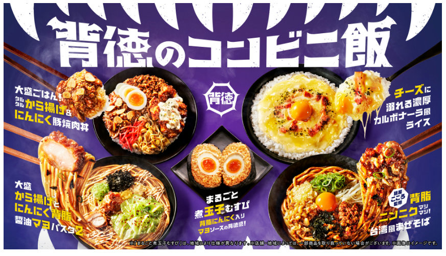 「背徳のコンビニ飯」は、“本能にあらがえない、禁断のウマさ。”をテーマに、おむすびやサンドイッチ、丼やパスタなどに、欲望を駆り立てる背脂・バターソース・にんにく・から揚げ・玉子・マヨソース・チーズの7種類の「背徳食材」を使用したオリジナル商品。