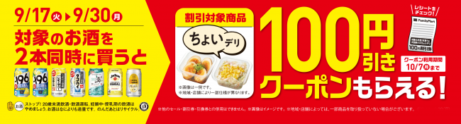 今回の新商品発売に合わせて、対象の酒を2本購入ごとに「ちょいデリ」シリーズに使える100円引きレシートクーポンキャンペーンを9月17日(火)から9月30日(月)まで実施している。