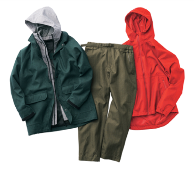 ウールライク特殊素材を採用。短繊維を採用することで、天然素材のような風合いを表現しながらも、防水性が高く、天然素材よりメンテナンスがしやすいように仕上げた。レインジャケット2900円、レインコート3900円、レインパンツ2900円(すべて税込)。