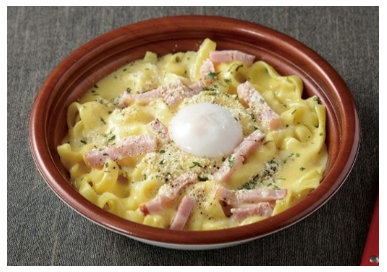 「ソースたっぷり カルボナーラ」は、従来品と比較して約3倍の量の卵黄と北海道産生クリームを合わせたコクのあるソースと、国産小麦100%使用の「もちもち」平打ちパスタ「フェットチーネ」を合わせたカルボナーラ。具材には、ベーコンと半熟たまごをトッピングした。