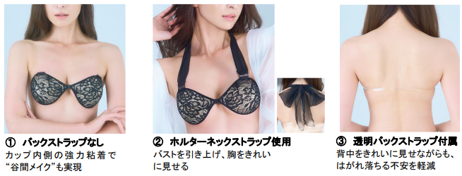 「私を自由にするブラ」は、カップ内側の強力粘着により①バックストラップなしでもバストをきれいに保持することができる。また付属の②ホルターネックストラップをつければバストを引き上げよりきれいに見せることができる。③透明なバックストラップも付属しているので、使用シーンに応じてパーツを選択できる。