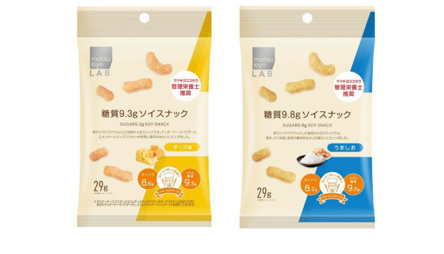 ・左「matsukiyo LAB 糖質 9.3g ソイスナック チーズ味」は、チェダーチーズとエメンタールチーズのパウダーをきかせた濃厚でコクのある味わいのソイスナック。