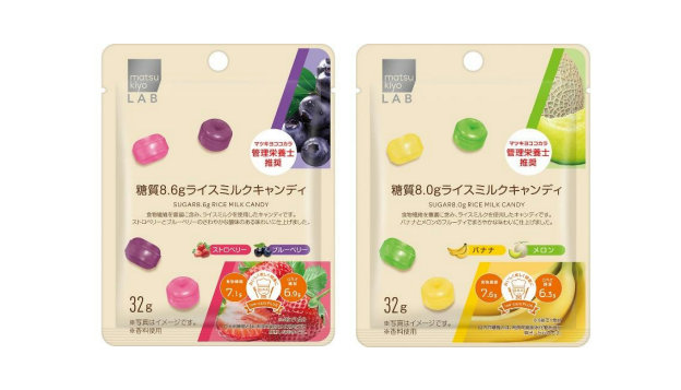 ・左「matsukiyo LAB 糖質 8.6g ライスミルクキャンディ ストロベリー・ブルーベリー味」は、さわやかで甘酸っぱい味わいが特徴のストロベリーとブルーベリーのフレーバーがアソートになったライスミルクキャンディ。
