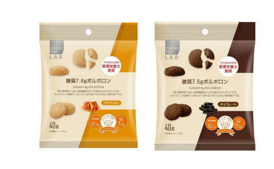 ・左「matsukiyo LAB 糖質 7.4g ポルボロン キャラメル味」は、濃厚なキャラメルの風味が広がるポルボロン。
