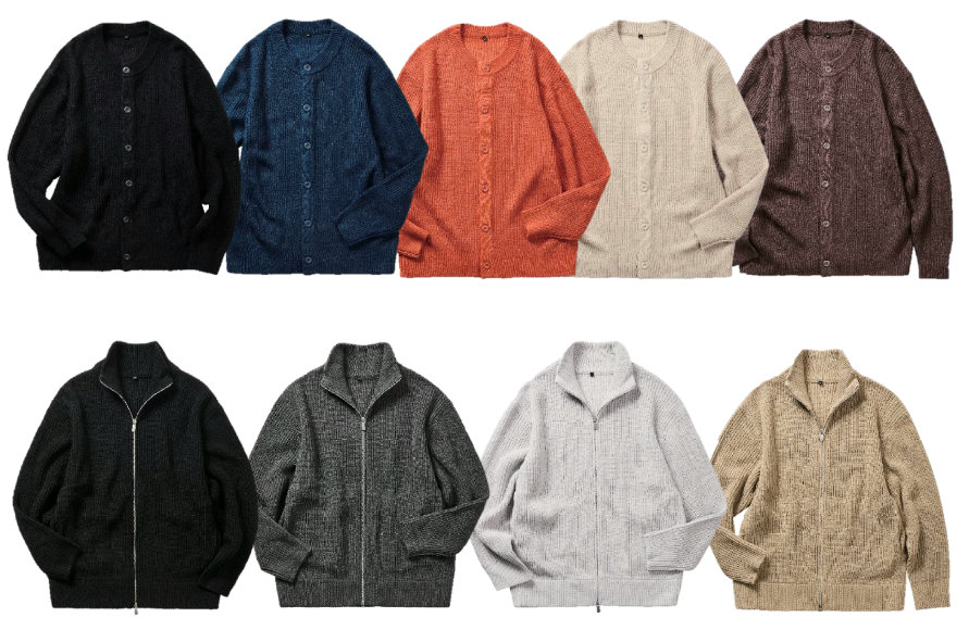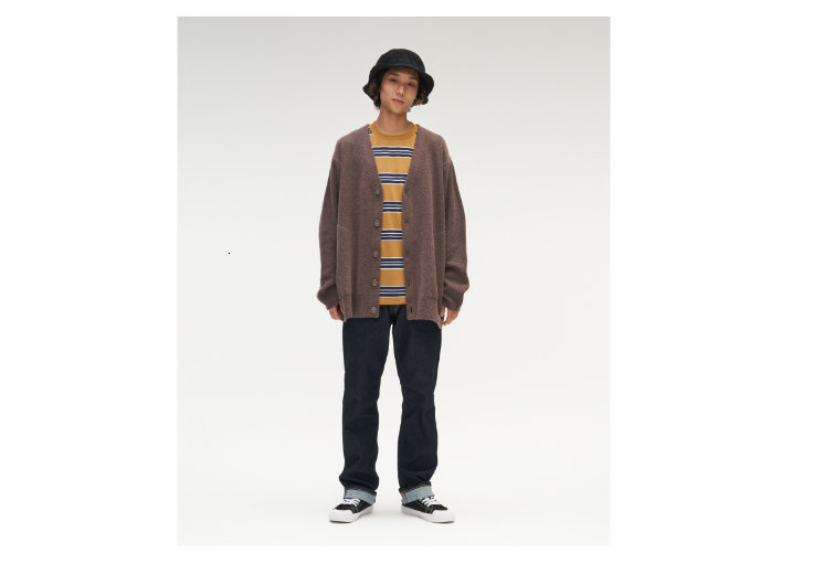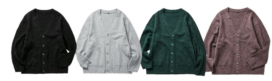 ふんわりとした起毛感が特徴のVネックデザインのカーディガン。オーバーサイズシルエットで体型カバーに効果的だ。ユニセックスデザイン。カラーはブラック、杢グレー、グリーン、マルーンの4色。サイズはS、M、L、LLで、税込み価格で1900円(以下同)。