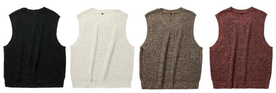 襟元はレイヤードを楽しめるVネック仕様で、幅広いシーズンで着こなせるリラックスフィットのニットベスト。カラーはブラック、ホワイト、カーキ、レンガの4色。サイズはF(フリー)で、価格は1500円。