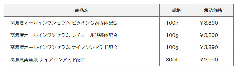 「高濃度オールインワンセラム」は、天然由来成分100%で保湿成分を高配合した、化粧水、乳液、美容液が1つになった手軽にスキンケアできる保湿ジェルだ。肌の悩みに応じて、保湿成分のビタミンC誘導体、レチノール誘導体、ナイアシンアミドをそれぞれ配合した3種類で展開する。さらに「高濃度美容液」シリーズにも新たに「高濃度美容液 ナイアシンアミド配合」が加わる。