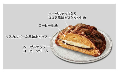 コーヒー生地に、ヘーゼルナッツ入りのココア風味のビスケット生地を合わせた。カスタードと組み合わせたコクのあるマスカルポーネ風味のホイップにヘーゼルナッツコーヒークリームをあわせ、生地と一緒に食べるとティラミスのような味わいを感じられるメロンパン。