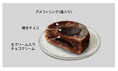 チョコ味のクロワッサン生地を使用。表面にはチョコクリームと塩味のきいたアメフィリングをあわせ、クイニーアマン仕立てにして、生クリーム入りのチョコクリームを包んで焼き上げた。