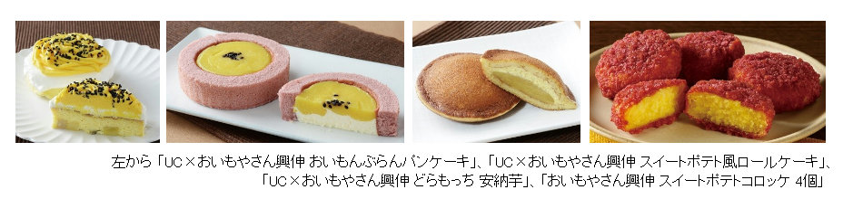 「UC×おいもやさん興伸 おいもんぶらんパンケーキ」は、食べやすいサイズにカットした紅はるかを加えたふわしゅわ食感のパンケーキに、北海道産生クリーム入りのミルククリームをかけ、その上に、さつま芋のペースト、ホイップ、カスタードをブレンドした濃厚な芋クリームをトッピング。隠し味として粉末醤油を表面にかけている。税込価格で346円(以下同)。