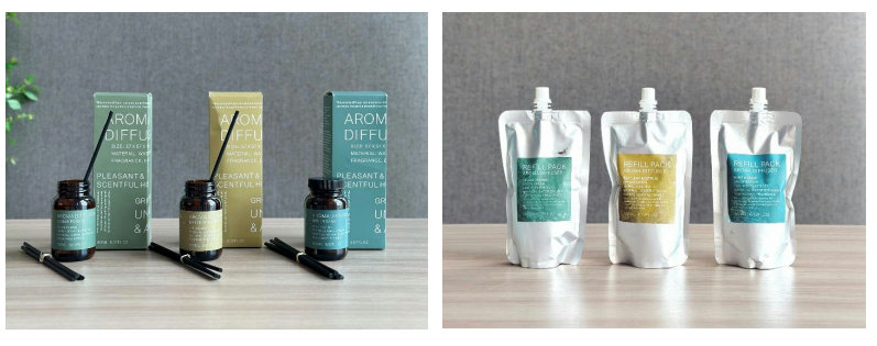 アロマディフューザーは150ml、リフィルは260ml。本体価格は各500円(以下同)。