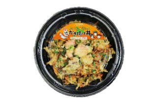 味噌バター風味の味つけと鮭の天ぷら、野菜かき揚げがのった丼弁当。本体価格は498円(以下同)。
