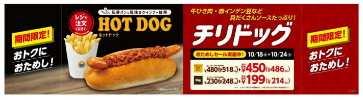 ミニストップ(株)(千葉市美浜区、藤本明裕社長)は10月18日(金)から、「ホットドッグ」の新フレーバーとして、具だくさんのソースをトッピングした「チリドッグ」を、国内のミニストップの店舗1827店(9月末時点)で発売する。また10月18日(金)から10月24日(木)の7日間限定で、おトクなおためしセールを実施する。