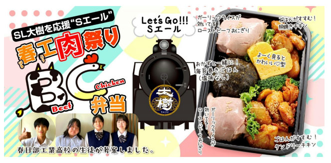 「Sエール 春工肉祭り BC弁当」は、照り焼き&タンドリーチキンの2種類のチキンとローストビーフで巻いたおにぎりの「ビーフもチキンも味わえる“お肉づくし”」な弁当。また、ポスターのデザインも生徒のアイデアが取り入れられている。本体価格は598円。
