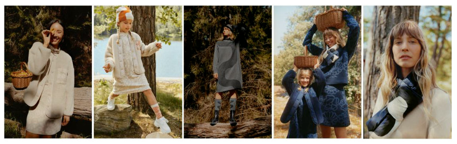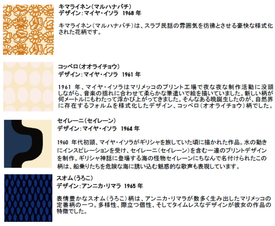 今回のコレクションは、秋の爽やかな日を美しく彩るアイコニックなプリントが特徴だ。Maija Isola(マイヤ・イソラ)がデザインするスラブ民話の雰囲気をほうふつとさせる花柄「キマライネン(マルハナバチ)」、自然界に存在するフォルムを様式化した「コッペオ(オオライチョウ)」、ギリシャを旅していたころにインスピレーションを受けた水の動きをデザインした「セイレーニ(セイレーン)」と、Annika Rimala(アンニカ・リマラ)がデザインするマリメッコの定番柄のうろこをイメージした「スオム(うろこ)」の全4種類のプリントで展開する。
