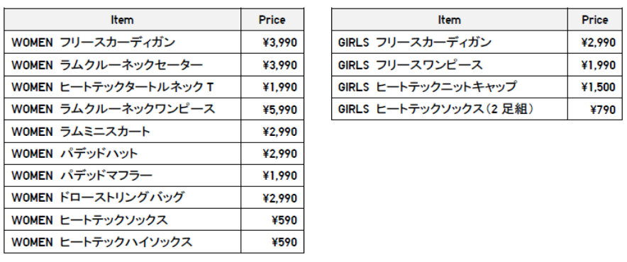 ウィメンズとガールズからラインナップし、お揃いの柄のコーディネートが楽しめる。暖かくやわらかい着心地のフリースカーディガンやラムウールのニット、冬の定番ヒートテックやパデッドマフラーのほか、ドローストリングバッグなどの色鮮やかな小物も展開する。
