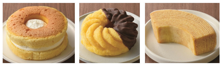 左「シフォンケーキ(佐渡産牛乳のホイップクリーム)」は、さっぱりとした味わいが特長の佐渡産牛乳入りクリームと、生クリーム入りのホイップクリームを、直径約11cmのシフォン生地ではさんだ。税込価格で346円(以下同)。真ん中「フレンチクルーラー(佐渡産牛乳のホイップクリーム)」は、佐渡産牛乳入りのホイップクリームを入れたフレンチクルーラー。価格は160円。右「佐渡牛乳のミルクバウムクーヘン」は、佐渡島産「佐渡牛乳」入りのクリームを生地に使用した、しっとり食感のバウムクーヘン。価格は173円。