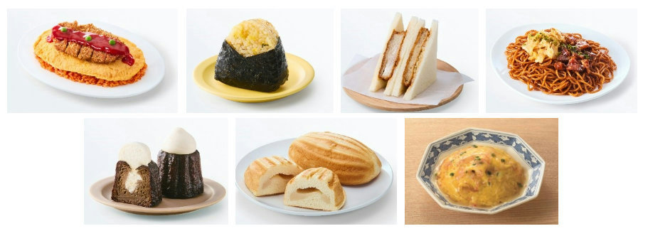発売する商品は、上段左から:「ほうらく監修 オムカツ」税込価格697円(以下同)、「RYU-RYU監修 おかかバターライス」171円、神戸の洋食屋の人気メニューをイメージした「ヘレかつ&神戸牛コロッケサンド」397円、神戸・長田の名物ぼっかけを具材にした「ぼっかけ焼そば」538円、下段左から:「観音屋監修 チーズクリームの珈琲カヌレ」297円、神戸のご当地パンとして親しまれる「神戸メロンパン(白あん入り)」138円の6品と、11月5日(火)発売の「南京町監修 天津飯」620円の合計7品。