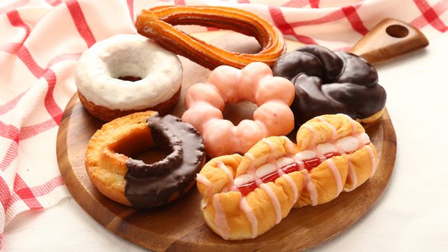 「with DONUTS」は季節ごとにラインナップを見直し、5種類から6種類のドーナツを展開する。6日から発売する新商品は、オールドファッションドーナツ チョコ、牛乳仕込みのミルクチュロッキー、モッチリング いちご、クロワッサンドーナツホワイトチョコ、スイートチョコドーナツ、ツイストサンド いちごジャム&ホイップの6種類。リニューアル前と変わらず、100円(本体)の均一価格で販売する。