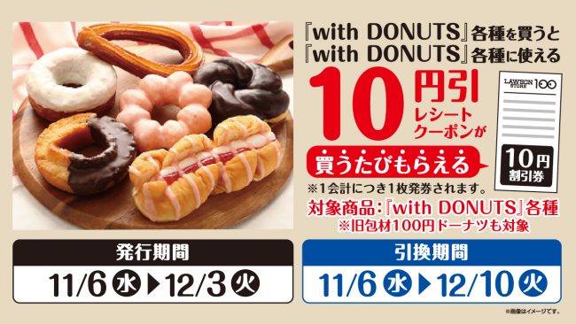 また発売を記念し、11月6日から12月3日までの期間中に対象の「with DONUTS」を購入すると、次回「with DONUTS」各種購入時に利用できる10円引きのレシートクーポンを1会計につき1枚進呈する。クーポンの利用期間は、11月6日から12月10日までとなっている。