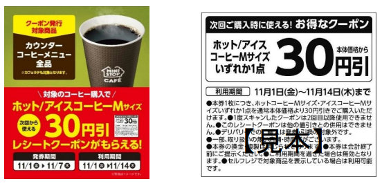 また対象のコーヒーを購入すると次回から使用できるホット/アイスコーヒーMサイズ 30円引レシートクーポンをプレゼントする。発券期間は11月1日(金)~11月7日(木)、 利用期間は11月1日(金)~11月14日(木)。